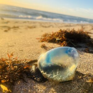 Nearby, many Portuguese man o’ war had washed in with the incoming eastbound winds.